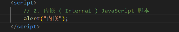 是指在 HTML 文件的<head>或 <body> 标签 中 , 可以使用 <script> 标签来包含 JavaScript 代码 , 这种书写方式称为 内嵌 JavaScript ;而不是通过<script>标签的src属性引入外部的.js文件。——适合比较简单的javascript代码。